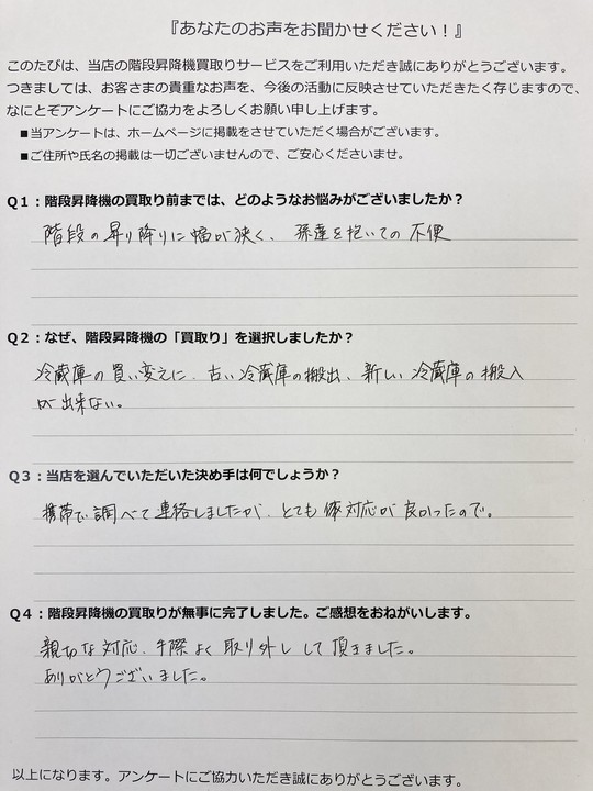 長年、階段昇降機の撤去をどうしようか悩んでいましたが、キリン階段リフトさんに相談してからスピード解決しました。